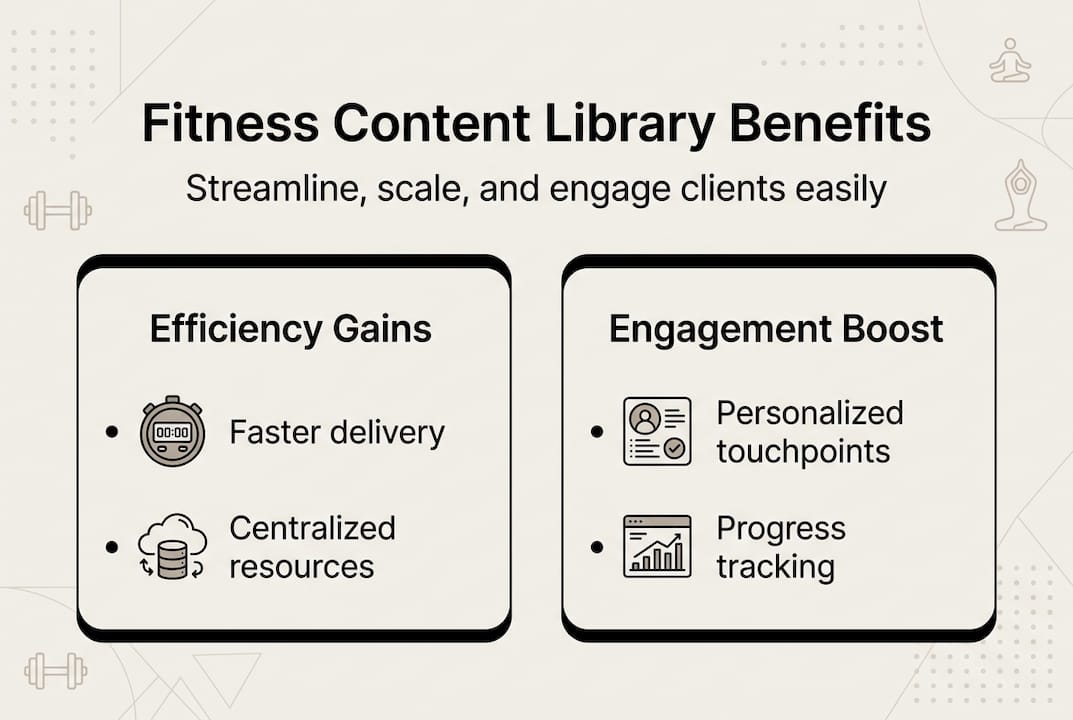 - A fitness content library is a structured, searchable system for delivering reusable coaching assets.
