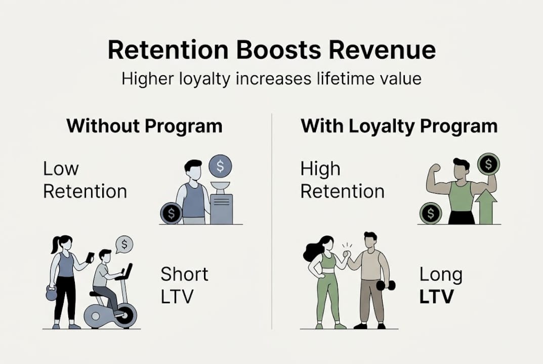 Aim for at least 66 to 71% annual retention for standard gyms and 70 to 80% for boutique or group training models. Higher retention rates consistently correlate with loyalty programs and structured engagement systems.