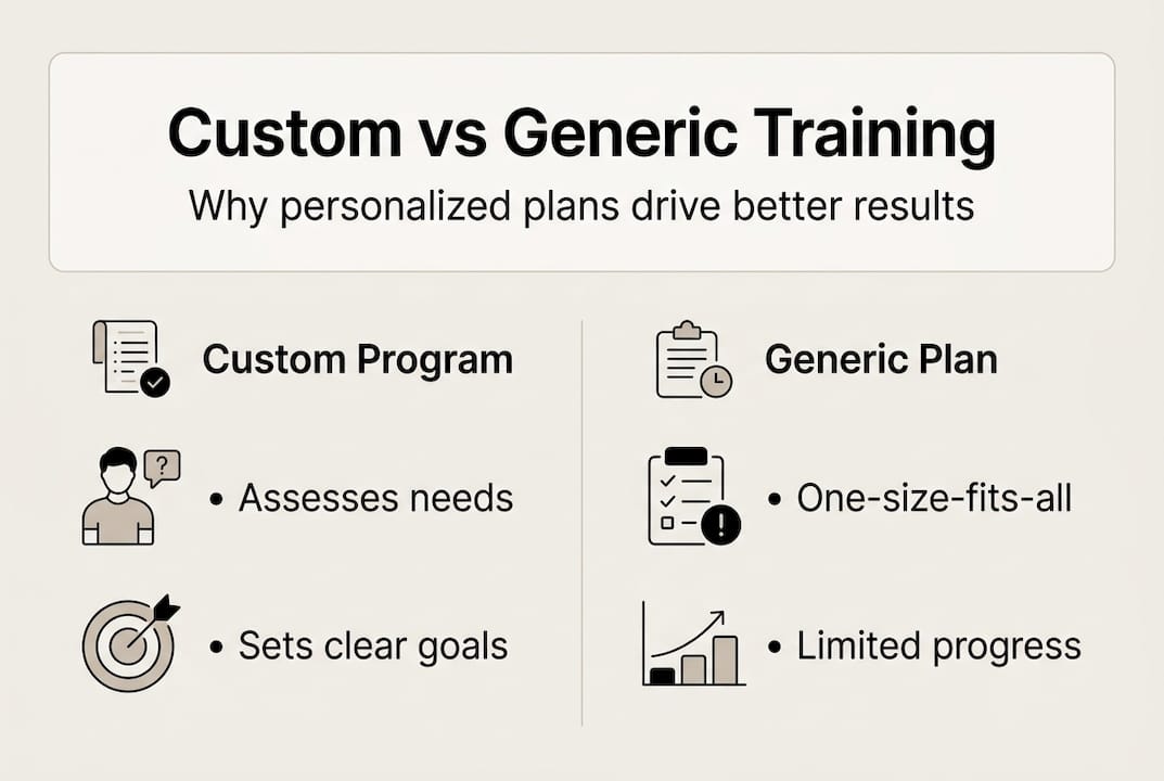 Custom programs address individual factors like injury history, movement limitations, lifestyle demands, and specific goals that generic templates ignore. This individualization improves adherence because clients experience fewer setbacks and see consistent progress. Research confirms customized approaches reduce injury risk while accelerating results compared to one-size-fits-all programming.